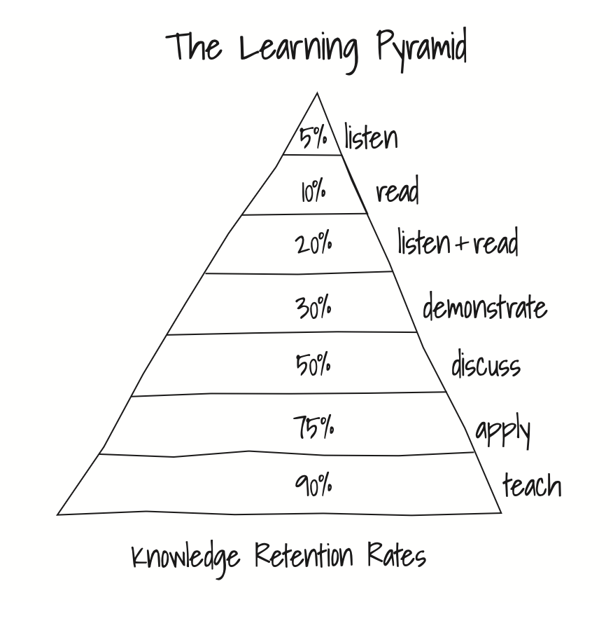 Teaching helps you retain more than 90% of what you’re learning as opposed to listening and reading, which generally sits around 20% knowledge retention rates. These numbers aren’t scientific. Whether they’re technically accurate or not isn’t as important as the pattern: Teaching is the best way to learn and retain what you learn.