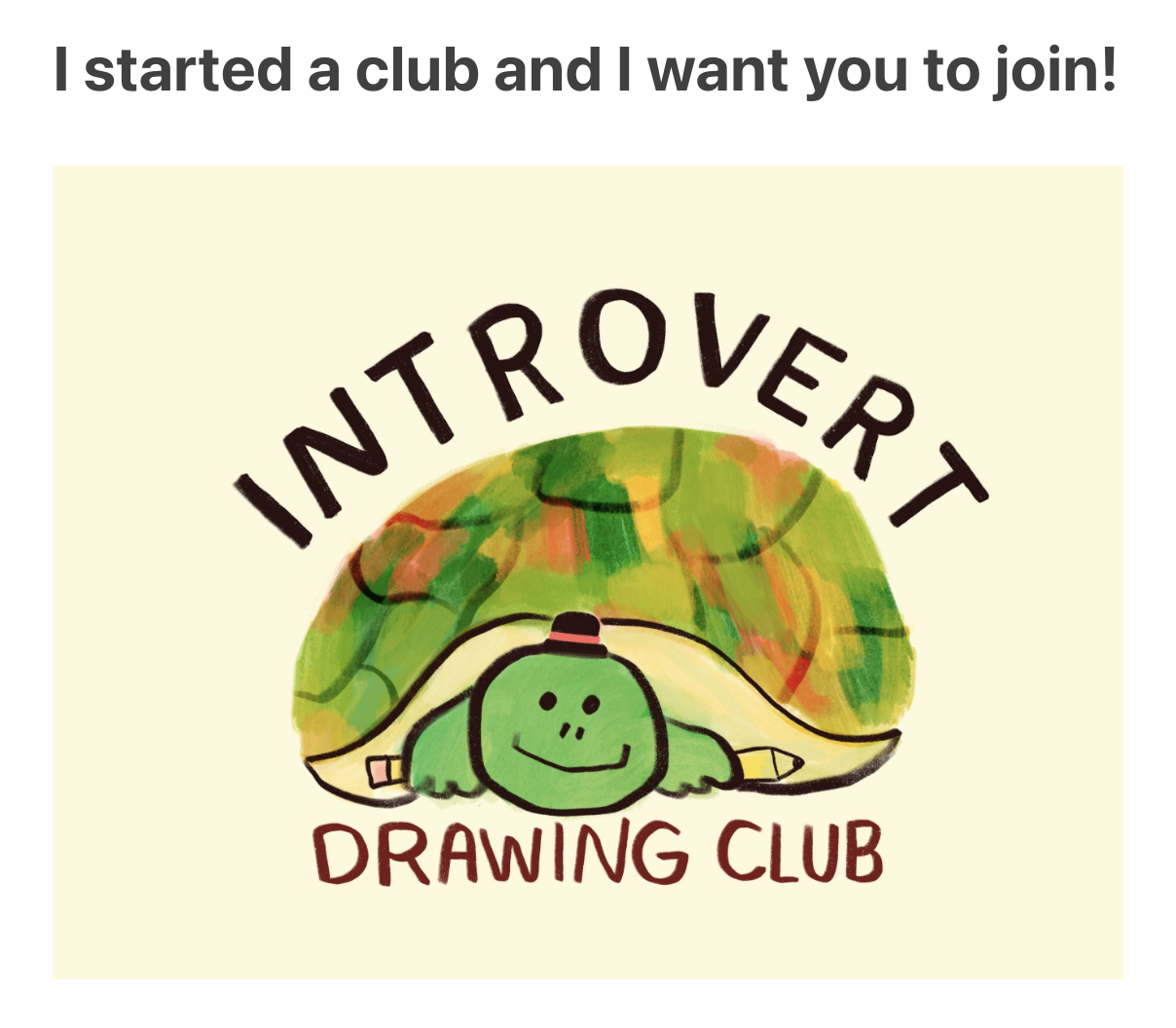 Since I loved hosting drawing sessions, it felt like an authentic choice to host some silent drawing sessions and rename my newsletter “Introvert Drawing Club.” I wanted to invite introverted artists to “come out of their shells” and draw without mics or cameras.
