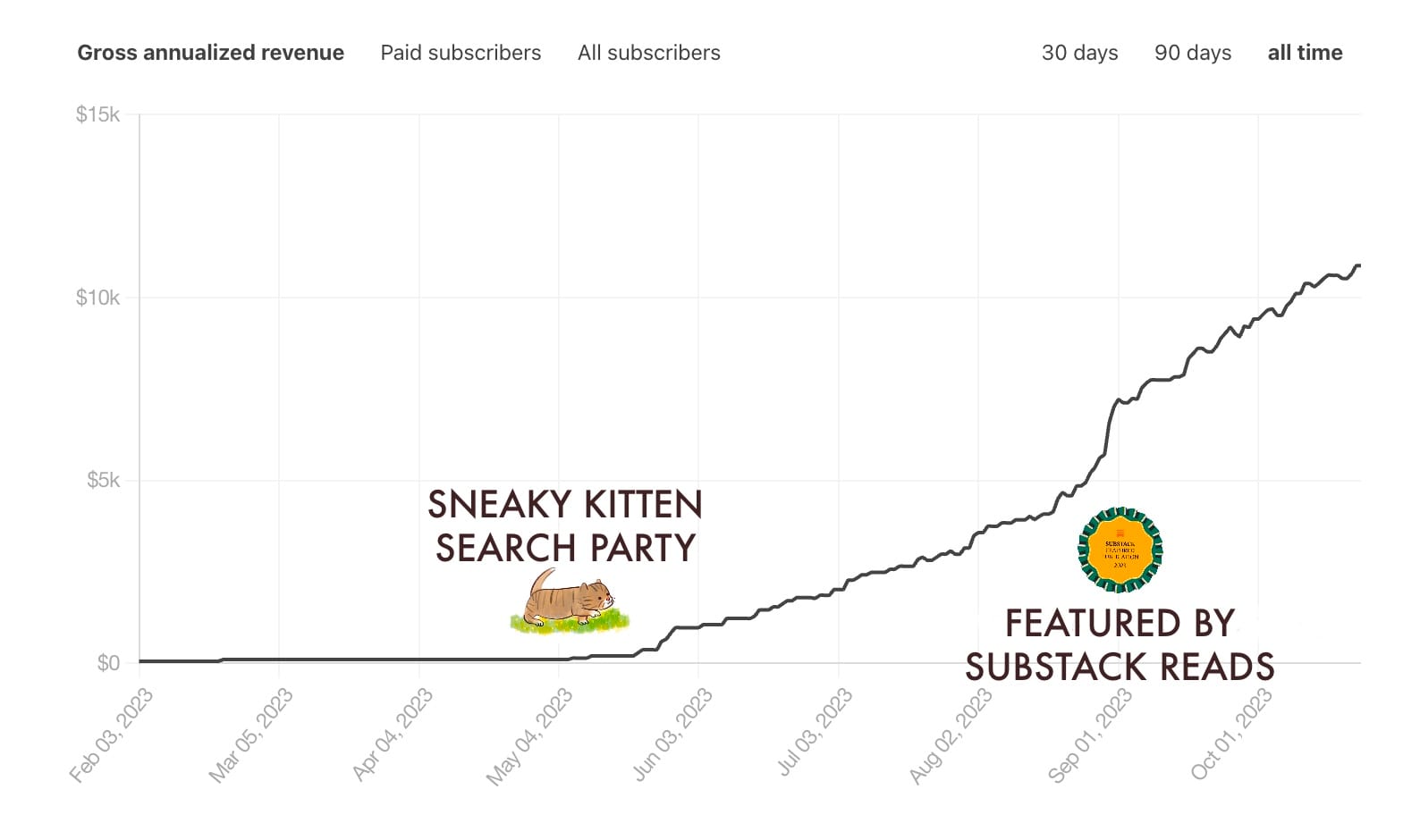 I started with 150 subscribers in November 2022, had 300 before the kitten campaign (which grew my count by 250), and am now closing in on 3K.S