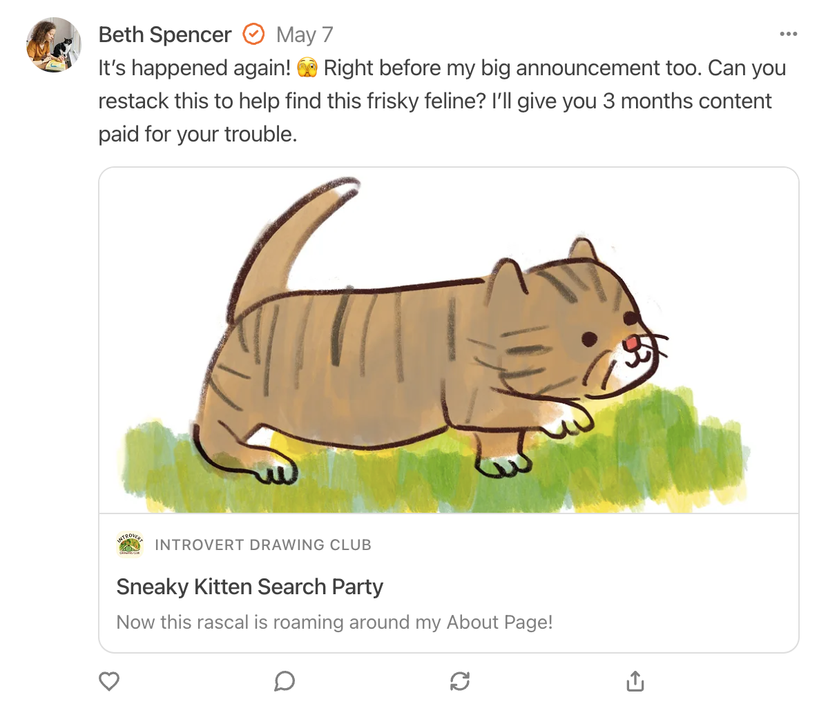 Substack had just launched Notes and it felt like the perfect place to recruit sneaky kitten hunters. I mentioned my “BIG ANNOUNCEMENT” in every post, but in reality, there wasn’t even a small announcement.