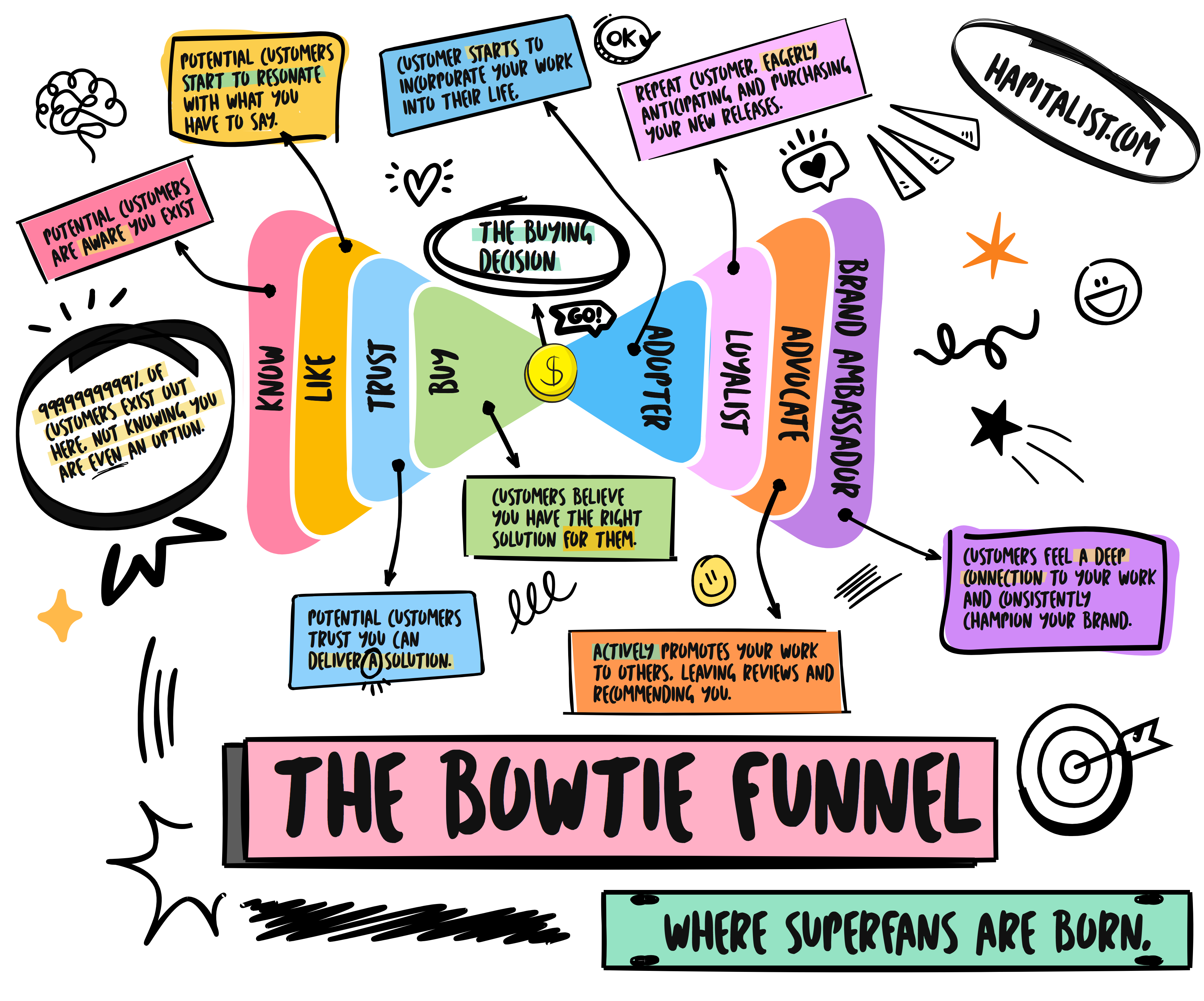 So how do you find and nurture these superfans? It starts by turning that sales funnel on its side and turning it into a bowtie funnel.