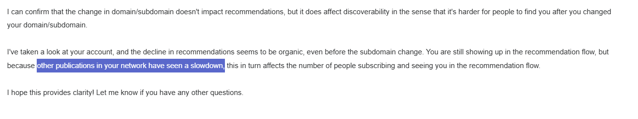 But what if we’re not the problem? Recently, I contacted Substack support because in the past two months I’ve gone from 100-200 recommendations a week down to 100 or so a month. I thought that maybe it was because I changed my subdomain.