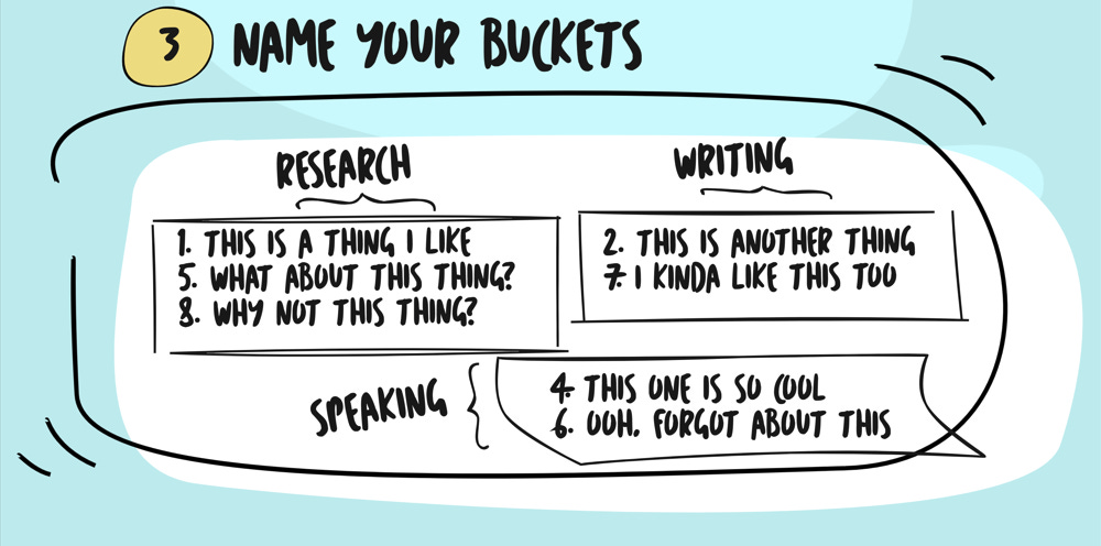 Those buckets are still unnamed because naming them too early makes it harder to see connections easily.