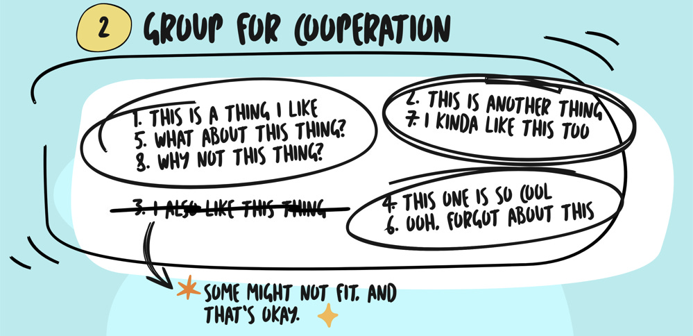 As you do this, expect friction. You’ll move items around. You’ll realize some things only seemed related until you put them next to each other. You’ll probably notice that one or two items don’t fit anywhere yet. That’s fine. Leave them out for now.