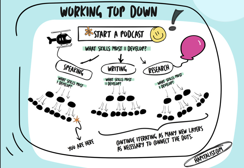 So far, we’ve talked about working bottom up by starting with what interests you, grouping it into buckets, seeing what aligns, and letting the next domino emerge from the work itself.