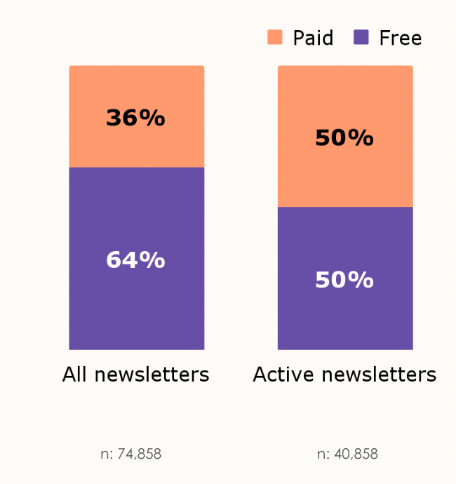 Another finding is that the more active newsletters are, the higher the paid subscription ratio is. Among 41K active newsletters, 50% offer a paid subscription, compared to just 36% across all 75K newsletters.