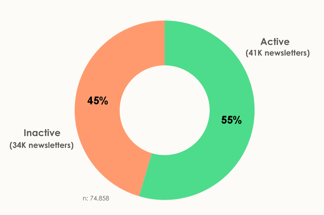 Data for the report is pulled on May 10th. Newsletters that published their latest issue within the past six weeks (between April 1st and May 10th) are classified as “Active.” On the other hand, newsletters that published their latest issue more than six weeks ago (before April 1st) are classified as “ Inactive.”